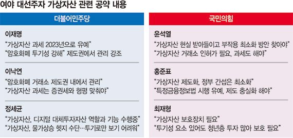 여당에선 가상자산을 인정해야 한다는 기류는 확실하다. 동시에 가상자산은 투기성이 강하다는 것도 지적하고 있다. 이에 따라 후보들은 과세 필요성을 적극 주장하는 한편 정부의 더욱 적극적인 관리 필요성도 제기하고 있다.