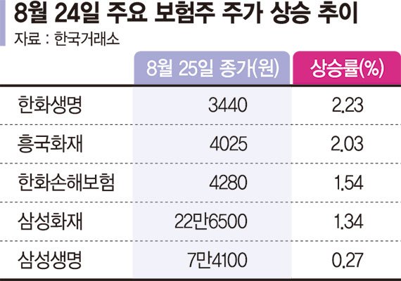 이 가운데 한화생명과 흥국화재는 각각 전날보다 2.23%, 2.03%씩 오른 3440원, 4025원에 거래를 마쳤다. 특히 한화생명은 최근 3거래일간 매일 2~3%대의 상승세를 보이면서 지난 20일 대비 9.03%나 올랐다.
