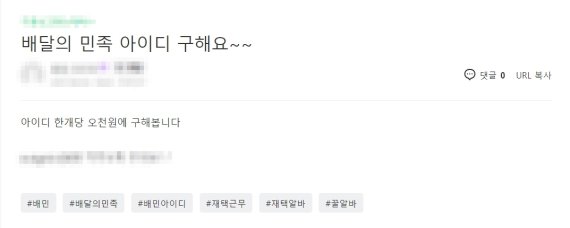 26일 국내 유명 중고거래 커뮤니티와 맘카페 등에서는 배민 계정이 개당 5000~2만원 선에 거래되고 있다. 계정을 판매하기 위해서는 구매자가 적어둔 카카오톡 아이디로 연락해야한다. 이때도 무조건 아르바이트를 하겠다고 말하면 답장을 들을 수 없고 '상담신청' 등 특정 문구를 암호처럼 말해야만 대화할 수 있다.