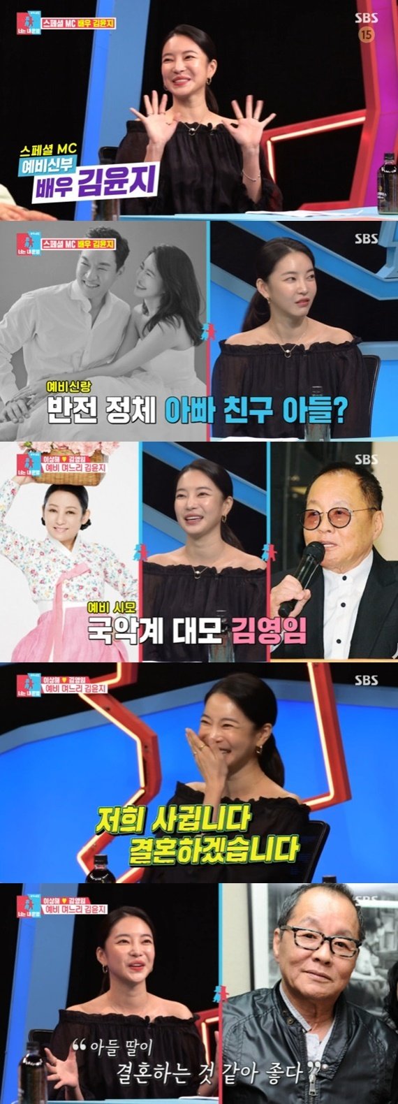 결혼을 앞두고 있는 김윤지는 예비 남편이 '아빠 친구 아들'이라고 밝히며 눈길을 끌었다. 예비 남편의 아버지가 자신의 아버지와 의형제와도 같은 사이라고. 더불어 예비 시부모가 코미디언 이상해, 국악인 김영임 부부라고 밝혀 모두를 놀라게 했다.