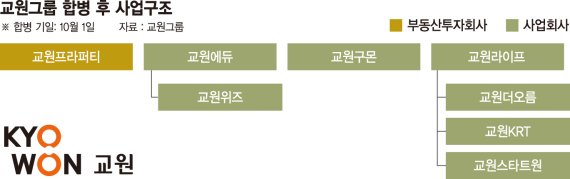 이번 합병으로 교원그룹은 크게 부동산·투자 부문과 사업부문 두 축으로 나뉘게 된다. 전체 계열사는 11개에서 8개로 줄어든다.
