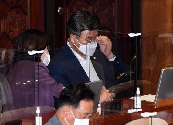 윤 원내대표는 부친의 부동산 투기 의혹으로 의원직 사퇴 의사를 밝힌 윤희숙 국민의힘 의원에 대해선 "야당이 (사퇴안을) 적극 처리하겠다고 하면 저희는 거기에 따르겠다는 입장"이라며 "윤 의원이 사직안을 낸 것이니까 회기 중엔 본회의에 상정 처리하게 돼 있다. 야당이 요구하면 받겠다는 입장"이라고 했다.