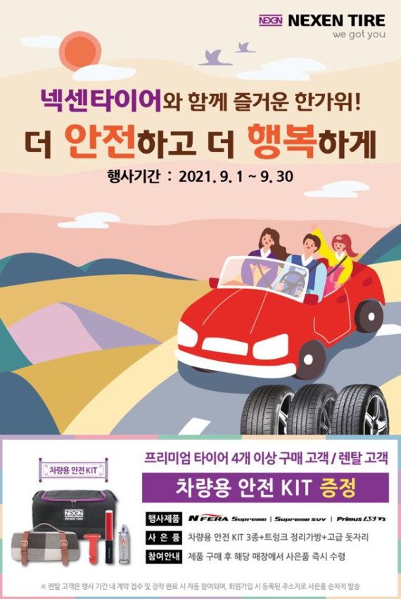 넥센타이어 관계자는 “추석 연휴 장거리 운행 및 늦은 장마철 빗길 안전 운전을 위해 차량용 안전 키트 증정 이벤트를 마련했다”며, “앞으로도 고객의 안전을 위한 다양한 서비스와 이벤트를 지속적으로 시행해 나갈 것”이라고 밝혔다.