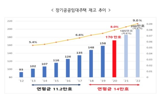 이는 2017년 문재인 정부 출범 초기에 비해 160% 증가한 수치다. 같은 기간 재고량은 135만 가구에서 170만가구로 26% 증가했다. 정부는 내년에는 공공임대주택 재고 200만 가구를 달성한다는 계획이다.