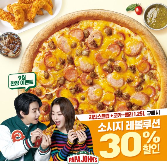 [파이낸셜뉴스] 한국파파존스가 오는 10월 5일까지 치킨 스트립과 코카-콜라 1.25L를 구매 시 '소시지 레볼루션 피자'를 30% 할인한다고 1일 밝혔다.