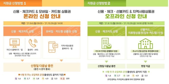 6일부터 온라인, 13일부터 카드사연계 은행창구나 읍·면·동 행정복지센터에서 신청할 수 있다.