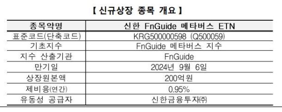 (서울=뉴스1) 손엄지 기자 = 한국거래소는 신한금융투자가 발행한 ‘신한 FnGuide 메타버스 상장지수증권(ETN)’을 오는 3일 유가증권시장에 상장할 예정이라고 1일 밝혔다.
