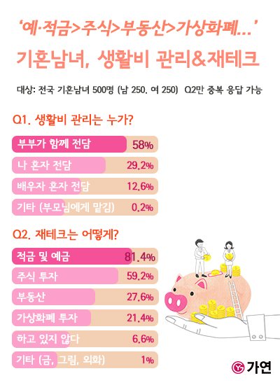 가연은 지난 7월 초 오픈서베이를 통해 25세 이상 39세 이하 전국 기혼남녀 500명(남 250, 여 250)을 대상으로 '생활비 관리와 재테크'에 대한 설문을 진행했다.