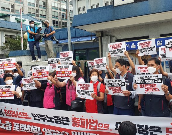 이날 민주노총 관계자 수십여명은 종로경찰서 앞에서 '양경수 위원장 구속 문재인정권 규탄한다' 등이 적힌 피켓을 들고 "양경수를 석방하라" 등 구호를 외쳤다.