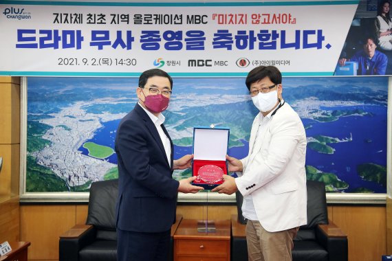 [창원=뉴시스] 강경국 기자 = MBC 드라마 ‘미치지 않고서야’ 제작진이 2일 코로나19 등 어려운 여건 속에서도 영상산업 발전에 도움을 준 것에 대해 허성무 경남 창원시장에게 감사패를 전달하고 있다. (사진=창원시청 제공). 2021.09.02. photo@newsis.com *재판매 및 DB 금지 [창원=뉴시스]강경국 기자 = 경남 창원시는 창원에서 올로케이션된 MBC 드라마 ‘미치지 않고서야’ 제작진이 코로나19 등 어려운 여건 속에서도 영상산업 발전에 도움을 준 것에 대해 감사패를 전달했다고 2일 밝혔다.