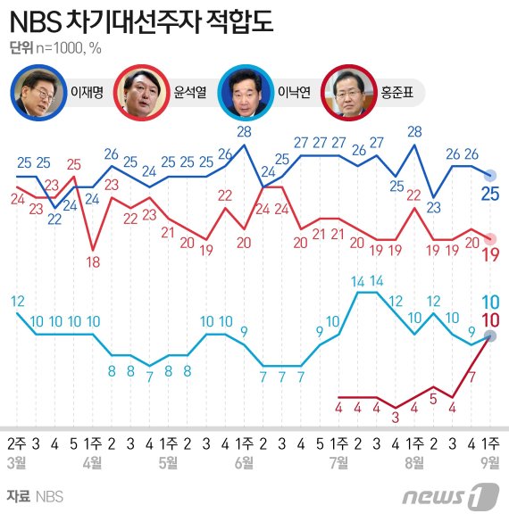 윤 전 총장은 22%로 1위를 기록했지만, 지난 조사인 8월3주차 조사보다 3%p 떨어지며 홍 의원과 격차는 오차범위 안으로 좁혀졌다.
