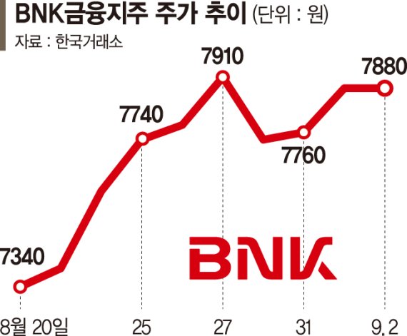이 가운데 BNK금융지주는 은행주 중 이날 유일하게 하락을 면했다. 주가는 전날과 같은 7880원에 거래를 마쳤다. 8월 23일 기준 최근 2주간 상승률은 약 7.4%다.