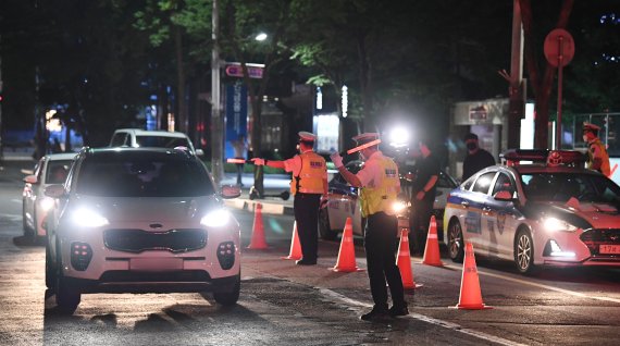2일 오후 서울 영등포구의 한 거리에서 경찰들이 신형 복합감지기를 활용한 음주단속을 펼치고 있다.이번에 보급한 감지기는 접촉과 비접촉 감지가 모두 가능하며 알코올 감지 센서를 바꾸고 공기 흡입 모터를 내장해 정확성과 편리성을 높였다고 경찰은 설명했다. 사진=김범석 기자