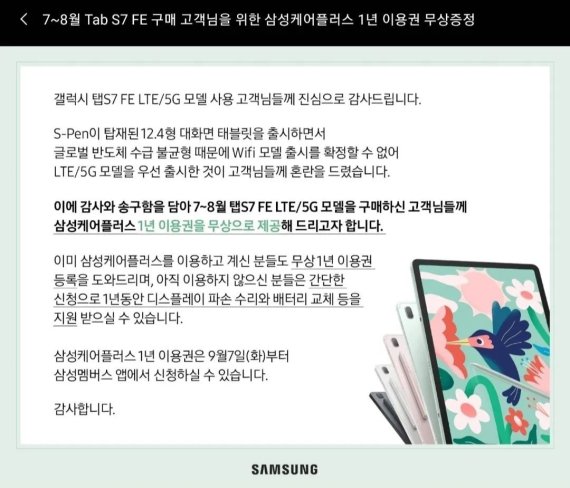 5일 업계에 따르면 삼성전자는 삼성닷컴을 통해 "감사와 송구함을 담아 지난 7~8월 갤럭시탭S7 FE LTE·5G 모델을 구매한 분들께 삼성케어플러스(+) 1년 이용권을 무상으로 제공해드리고자 한다"고 공지했다.