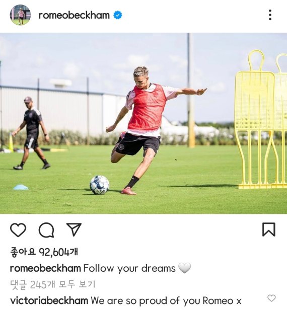 로미오의 어머니 빅토리아 베컴은 "우리는 네가 자랑스럽다"는 댓글을 달았다.