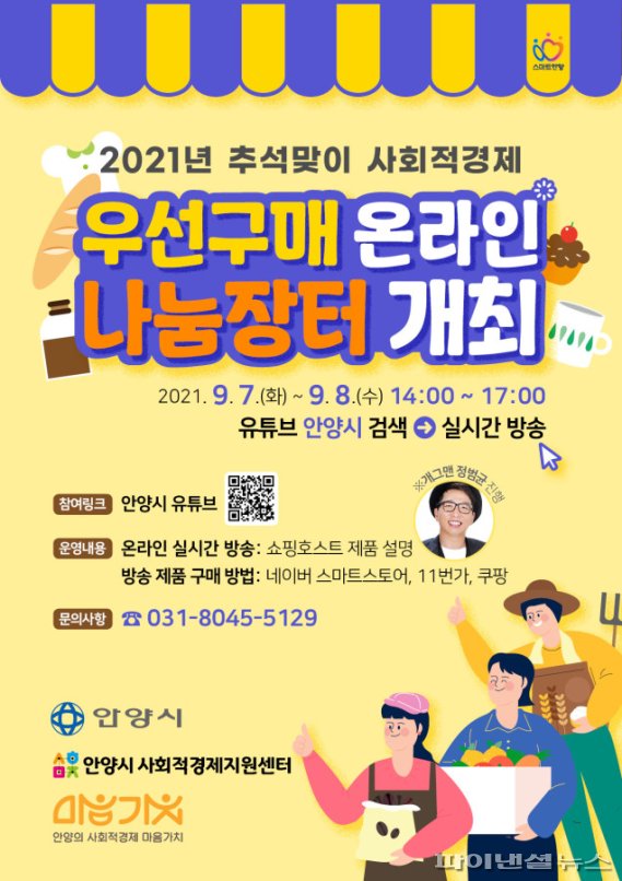 【파이낸셜뉴스 안양=강근주 기자】 안양시가 추석맞이 사회적경제 우선구매 온라인 나눔장터를 개설해 오는 9월7일부터 11월6일까지 두 달 동안 운영한다. 특히 7일과 8일 이틀 동안은 추석특집으로 운영된다.