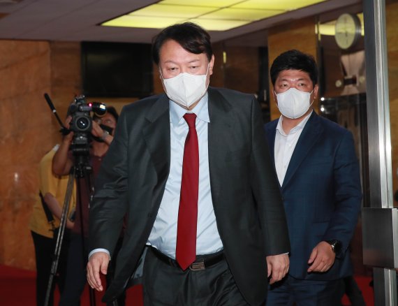 [서울=뉴시스]최서진 김승민 기자 = 윤석열 전 검찰총장이 6일 국민의힘 당대표실을 찾아 이준석 대표와 1시간여 간 면담을 진행했다.