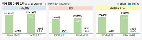 전문가들은 택배분류인력 지원으로 비용이 발생했지만 택배비를 인상하면서 상반기 실적을 선방했다고 평가했다. 업계 관계자는 "택배 물동량 증가에 따라 매출 등 외형 성장세는 지속되고 있다"며 "올해 근로환경 개선을 위해 비용부담이 늘어났지만 4월부터 (택배비) 가격 인상으로 이를 만회하고 있다"고 분석했다.
