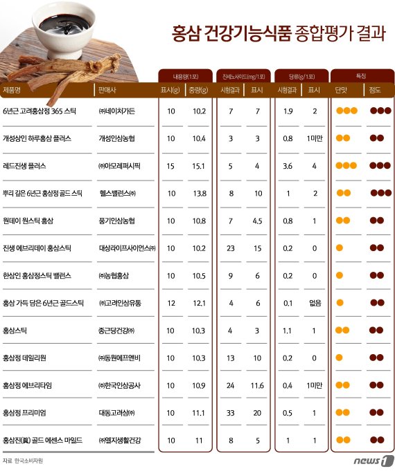 한국소비자원은 소비자 선호도가 높은 홍삼 건강기능식품 스틱형 제품 13개를 대상으로 품질과 안전성, 표시 적합성 등에 대해 시험·평가한 결과 이같이 나타났다고 7일 밝혔다.