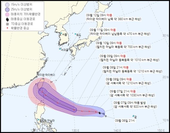 10일 오전 9시에는 마닐라 북동쪽 약 700㎞ 부근 해상, 11일 오전 9시에는 대만 타이베이 남남동쪽 약 470㎞ 부근 해상까지 이동할 것으로 보인다.