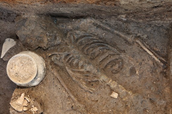 2017년과 이번에 발굴한 인신공희 유구는 구멍의 어귀가 낮은 넓은 토기 안에 작은 토기를 넣은 토기들을 함께 발견됐다는 점도 동일하다. 다만 이전 유구는 발 아랫부분에 서 발견했다면, 이번엔 머리와 어깨 사이에서 토기를 확인했다.