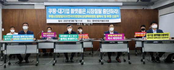 서울상인연합회·전국중소유통상인협회 등으로 구성된 '쿠팡 시장침탈저지 전국자영업 비상대책위원회'(쿠팡비대위)는 7일 오전 서울 종로구 참여연대에서 기자회견을 열고 "플랫폼의 등장으로 유통생태계가 파괴되면서 기존의 유통 대기업들마저 여기에 동참해 기존의 규제들을 모두 파괴하려 하고 있다"며 "우리의 삶의 터전과 생존권을 지키기 위해 끝까지 싸울 것"이라고 밝혔다.
