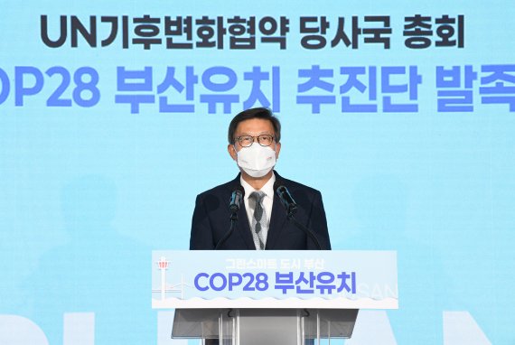 박 시장은 이날 오후 벡스코 컨벤션홀에서 개최된 'COP28 유치 추진단 발족식'에 참석해 "탄소중립의 새로운 문명을 향해 인류가 나아가야 할 길을 제시하는 중대한 총회를 우리 부산으로 유치하려고 한다"고 밝혔다