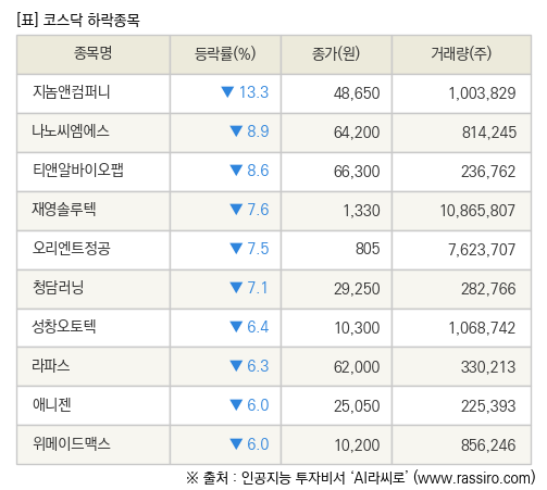 [fnRASSI]장마감, 코스닥 하락 종목(지놈앤컴퍼니 -13.3% ↓)