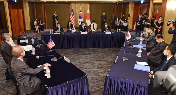 (서울=뉴스1) 박재우 기자 = 한미일 북핵수석대표가 다음주 일본 도쿄에서 3자 회동을 갖고 북한을 대화에 끌어들이기 위한 방안을 논의한다. 최근들어 한미 간 '대북 인도적 지원'과 관련해 잦은 논의가 있었기 때문에 이와 관련한 논의가 주를 이를 거란 전망이 나온다.