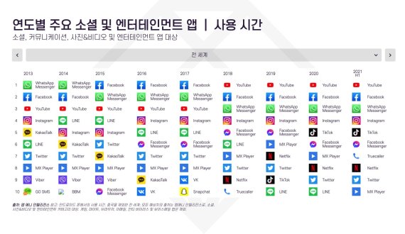 데이비드 김 앱애니 한국 지사장은 "2021년 말까지 중국 외 지역의 상위 5개 소셜 앱의 사용시간은 안드로이드 스마트폰 에서만 5조 시간을 넘어설 것으로 전망된다"며 "텍스트에서 사진, 동영상, 음성, 동영상 및 라이브 스트리밍까지 무궁무진하게 발전하는 소셜 앱들의 성장세는 당분간 지속될 것이다"고 밝혔다.