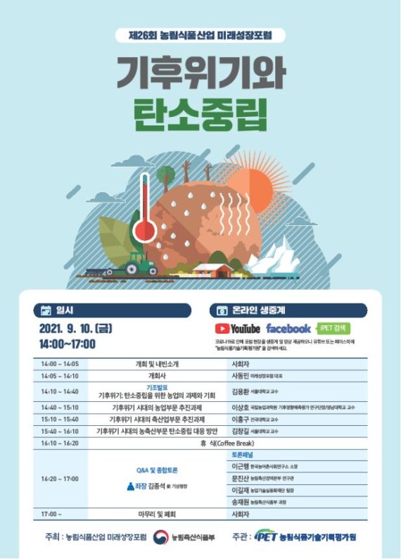 포럼은 온라인으로 생중계될 예정으로, 관심 있는 사람은 누구나 농림기술기획평가원 페이스북과 유튜브 채널, '2021 농식품과학기술대전' 홈페이지를 통해 시청할 수 있다.