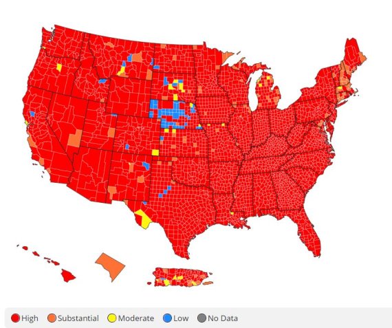 더힐은 7일(현지시간) 미 질병통제예방센터(CDC)의 코로나19 데이터 추적기를 인용해 미국 카운티 3065곳, 95.19%가 코로나19 전염률 '높음'(high) 수준을 기록 중이라고 보도했다.