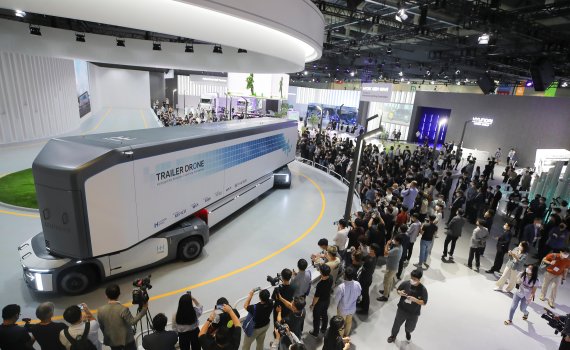 8일 고양시 킨텍스 2전시장에서 개막한 “2021 수소모빌리티쇼”에 마련된 현대자동차 부스를 찾은 내빈들이 현대차의 트레일러드론 시연을 관람하고 있다.사진=박범준 기자