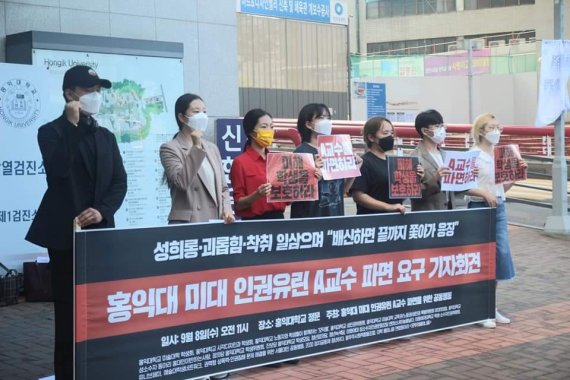 공동행동 관계자들은 8일 오전 서울 마포구 홍익대 정문 앞에서 기자회견을 열고 A교수의 성희롱 만행 등을 폭로하면서 피해자 보호 및 A교수 파면 등을 요구했다.