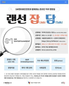서울시자원봉사센터는 지난 7일 SM엔터테인먼트 임직원 8명이 청년 58명과 만나 자신이 가진 직무 지식과 경험을 나누는 온라인 직무 멘토링 '랜선잡(job)담(talk)'이 진행됐다고 10일 밝혔다.