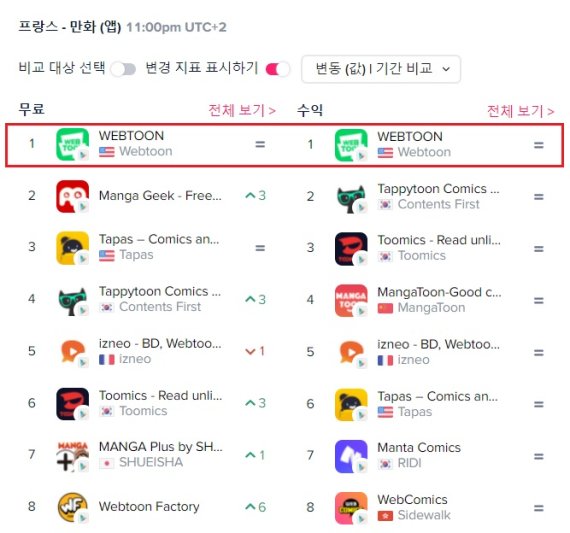 글로벌 앱 조사업체 앱애니에 따르면 네이버웹툰은 프랑스 구글플레이 만화 부문 매출은 물론 다운로드 수도 1위를 달성했다.