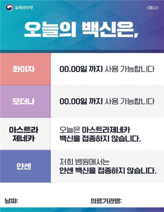 접종기관은 당일 접종하는 백신의 종류와 유효기한 확인 후, 접종대상자가 쉽게 알아볼 수 있도록 대기실과 접종실에 '오늘의 백신' 안내문을 13일부터 게시해야 한다.