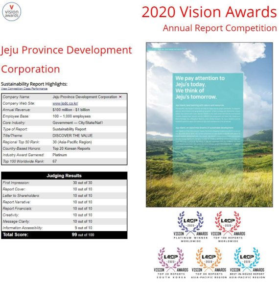 (서울=뉴스1) 황덕현 기자 = 제주개발공사의 지속가능경영보고서가 미국 커뮤니케이션 연맹이 주관하는 '2020 비전 어워드'(Vision Award)의 거버먼트 경쟁부문에서 플래티넘에 선정됐다고 13일 밝혔다.