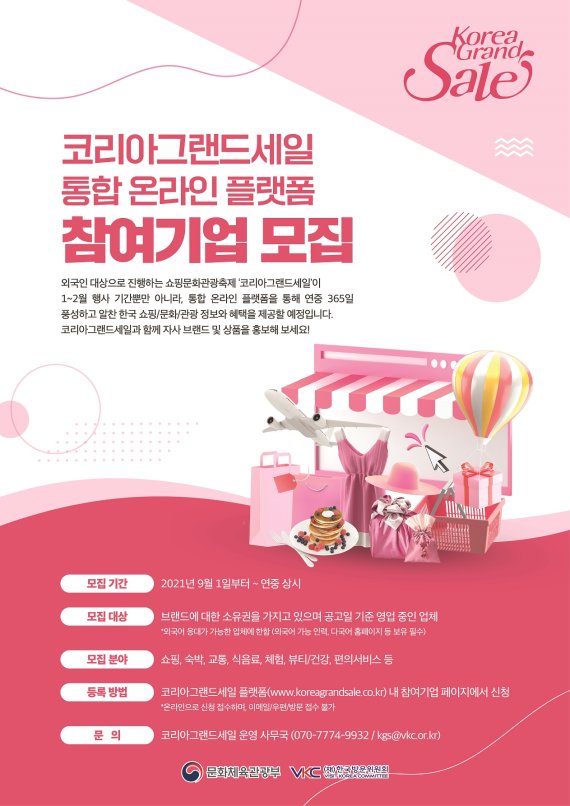 [파이낸셜뉴스] 한국방문위원회는 한국의 쇼핑문화관광 콘텐츠와 혜택을 제공하는 ‘코리아그랜드세일 통합 온라인 플랫폼’에 입점할 참여기업을 모집한다.