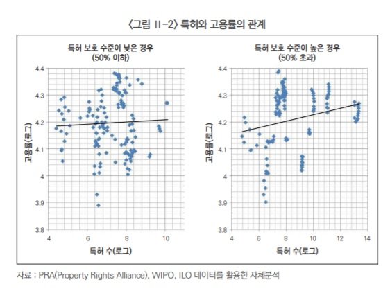 또 특허 보호 수준이 OECD 국가들의 최하위 수준일 때는 특허가 증가해도 고용률이 감소하는 것에 대해 "특허가 보호되지 않아 특허 보호에 따른 수익이 없고, 오히려 특허에 투입된 비용으로 손해를 입어 고용을 줄여야 하는 상황에 이를 수 있기 때문"이라고 설명했다.