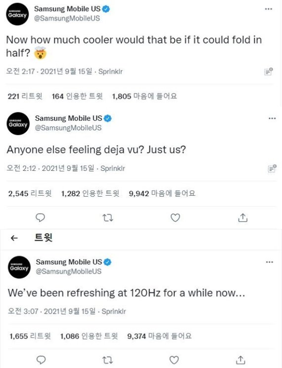 해당 트윗은 기본 '바'(Bar) 형태로 출시된 아이폰13을 겨냥한 것으로, 삼성전자가 지난 8월 공개한 폴더블폰 갤럭시Z폴드3와 갤럭시Z플립3를 떠올리게 했다.