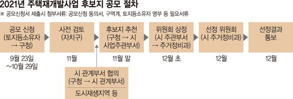 11월 중 자치구가 사전검토를 통해 25개 자치구별로 4곳 이내로 추천하면, 서울시는 12월 중 '선정위원회'를 열고 후보지를 최종 선정한다.