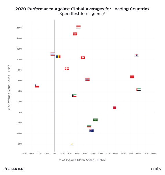 또한, 우클라는 한국이 초고속인터넷 부문에서 매년 순위가 하락했다면서도 초고속인터넷, 모바일 속도 상위 10위권에 둔 유일한 국가로 꼽았다. 특히 한국과 아랍에미리트는 평균 모바일 다운로드 속도가 전 세계 평균보다 240% 더 빠른 것으로 나타났다. 초고속인터넷 속도는 70% 더 빨랐다.