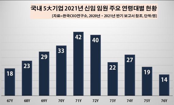 반면 2021년 인사에서 65~69년생 신임 임원 숫자는 94명으로 30%를 밑돌았다. 작년 말 이후 인사에서 60년대 후반대 출생자 보다는 70년대 초반생을 더 많이 발탁했다는 방증이다.