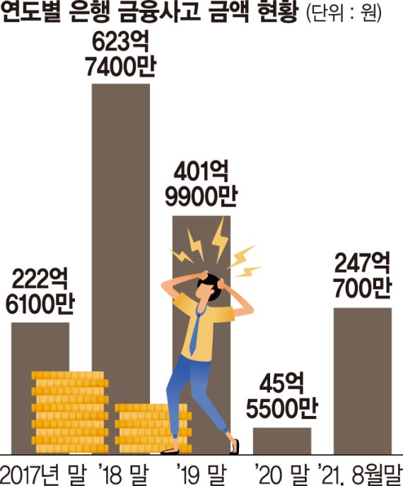 지난 5년 간(2017년 말~2021년 8월 말) 국내 은행의 금융사고 금액은 총 1540억9600만원이었다. 금융사고 유형을 보면, 사기, 횡령, 업무상 배임이 대부분을 차지했다. 은행별 금융사고 금액을 보면 우리은행 422억6700만원, 부산은행 305억5300만원, 하나은행 142억2700만원, NH농협은행 138억6800만원, DGB대구은행 133억8300만원, 신한은행 104억3000만원, 한국수출입은행 79억8100만원, KB국민은행 76억5900만원 등이었다.