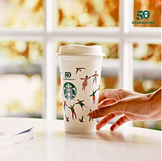 이날 제조 음료 주문 고객에게 글로벌 스타벅스 50주년 기념 특별 디자인이 적용된 그란데(16oz) 사이즈 다회용 컵에 음료를 담아 제공한다.