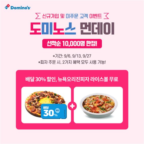 '도미노스먼데이…배달 30% 할인·뉴욕 오리진 피자 라이스볼 각 선착순 1만명