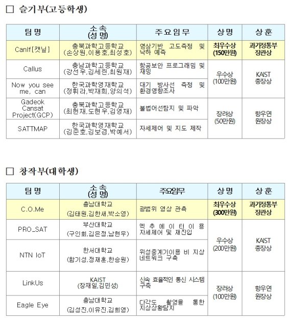 경연대회 본선과 최종 발표평가 결과 슬기부·창작부 각 최종 5팀(총 10팀)이 선발되었으며, 최우수상으로는 충북과학고등학교 'CanIf'팀, 충남대학교 'C.O.Me'팀이 과기정통부 장관상을 수상하는 영예를 안았다.