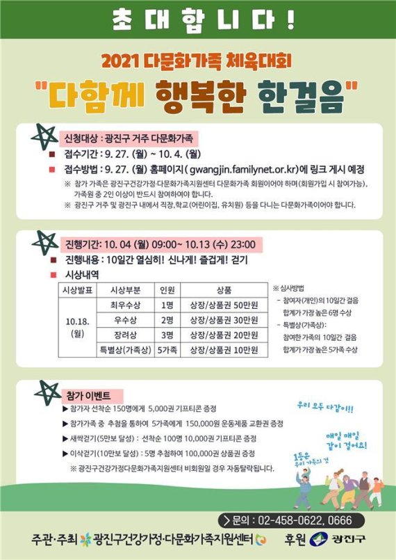 (서울=뉴스1) 이밝음 기자 = 서울 광진구는 다문화가족 온라인 걷기대회 참여자를 10월4일까지 선착순 모집한다고 28일 밝혔다.