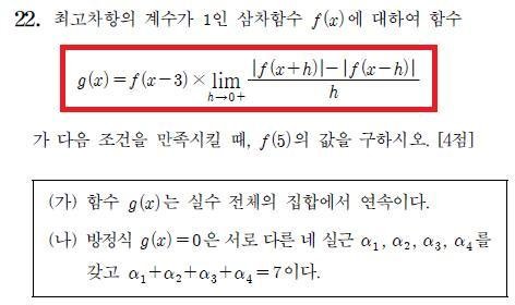 그러나 사걱세는 "주어진 함수 g(x)에는 극한과 절댓값이 함께 포함돼 있어 함수 g(x)의 형태는 지나치게 복잡한 형태"라며 "풀이 과정 중에 삼차함수 그래프가 그려질 수 있는 6가지 경우의 모든 그래프 개형을 생각해야 하므로 그 풀이 과정 또한 지나치게 복잡하다"고 지적했다.